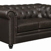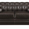 This ultraplush feather down topped loveseat in brown bonded leather is a pinnacle of class and high style Its hightrack rolled arms and tufted seating contribute to its traditional aesthetic Quality and durability also abound thanks to its solid wood frame and square wooden legs in dark finish Pair with its companion sofa and chair for a complete living room set