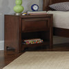 Hip and casual both describe the pieces in the Greenough Collection A spectacular cappuccino finish over Asian hardwood and maple veneer and a transitional style ensure this bedroom set will remain popular with your child from toddler to teen The nightstand for this collection offers one drawer for storing magazines books and anything that may clutter the room A raised beveled edge on the drawer front adds a soft detail to the otherwise smooth design The open shelf is a great place to keep accessories you want to show off Function is added with the included two USB outlets