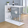 Entertain in style with this sleek contemporary bar unit featuring two glass storage shelves and a wine glass holder Finished in a gloss white and topped with chrome accents this bars minimalist aesthetic brings a high level of modernity to your home bar area Place bar stools around this unit to easily convert into a casual dining option