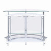 Serve your guests in style with this sleek contemporary Glass and Chrome Bar Unit Featuring a tempered glass top acrylic panels two large shelves and a stemware rack this unit is as beautiful as it is functional Also available in white with clear glass and acrylic and in black with smoked glass and acrylic