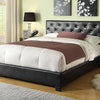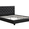 Upholstered in black faux leather from top to bottom this queensize bed makes a sophisticated impression and offers plenty of welcoming comfort Deep tufting gives the headboard plush support perfect for leaning against over long evenings with a favorite book or movie Each tuft sparkles with a rhinestone button for a touch of glamour and glitz