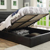Find plenty of space for your extra comforters and sheets with this convenient hydraulic lifttop storage bed from the Riverbend Collection Upholstered from top to bottom in textural faux leather this handsome queensize bed looks and feels highend The headboard features channeled tufting giving extra support for sitting up in bed with a favorite book The streamlined profile is a perfect fit for interior styles ranging from casual to contemporary