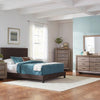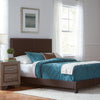 The cozy chic design of the Boyd Upholstered California King Bed available in a variety of colors works with nearly any dcor from traditional to modern The bed is upholstered in brown and comes detailed with individual chrome nail heads framing the headboard Also features solid wood legs finished in warm espresso
