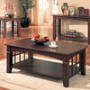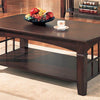 This rectangular coffee table from the Abernathy Collection offers a transitional style for your living room setup This wooden piece finished in a warm cherry color features arched sides and a grid work framing Use this table as a focal point in your living room A lower shelf to this coffee table adds additional storage options