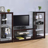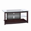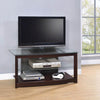 This TV console is your classic entertainment center piece with unique tempered glass elements With a brown finished wooden frame and bronze finished metal support this TV stand features tempered glass tops and shelves for a modern element For a maximum TV size of 55 inches and 77 pounds this TV console will work well with most contemporary living room decor A matching media tower can also be added for more storage space