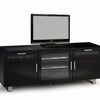 This black television console features a high-gloss finish and metallic hardware for a minimalist modern look. This piece offers shelves and cabinets in a variety of sizes to accommodate everything you need to complete your media center. A convenient power drawer makes it easy to keep devices charged.