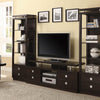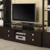 This casual TV console offers plenty of storage space for virtually limitless entertaining possibilities Finished in a cappuccino color this unit features a floating top shelf and pushtoopen drawers The metal square hardware and accents complete the look This sturdy console will support TVs up to 60 inches and 132 pounds Match this console with its complementing media towers for a complete entertainment unit