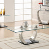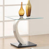This ultramodern end table might end up being confused for a work of art in your living room With a largescaled satin finish metal arched support and a highsheen black base this modern table features a floating glass top for elegance and artistic design and function Let this exquisite piece shimmer in your contemporary room