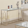 This sofa table features a contemporary design with nickel finish and tempered glass table top It celebrates a crisp fresh appearance that will certainly bring life to any home it graces Its geometric motif can be a pleasant compromise between a couple who have very different interests Its height is perfect to showcase family portraits or a beloved art piece