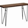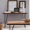 Tall hairpin style legs give this attractive sofa table a strong hint of midcentury modern influence The tabletop is constructed from solid mahogany with light hickory veneer a combination that ensures fantastic durability for the value While this piece would be an asset for any living room interior this flexible and compact design could work well anywhere in the home