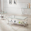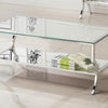 Make a dazzling statement with this bold coffee table in polished chrome The tempered glass tabletop allows the reflective metal details to take center stage even revealing a mirrored lower shelf that can double the effect of any decorations it holds This piece is ready to become a dazzling focal point that sparks conversation