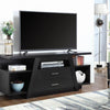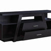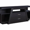 Give your TV a leg to stand on with this contemporary TV stand Available in a deep cappuccino finish this TV stand features open shelving on the sides with unique pyramid shaped drawers in the center for your media center essentials Silver finished hardware completes the look Support your TV and all its accessories on this TV stand