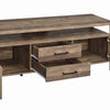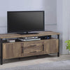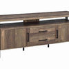 59 TV console finished in rustic oak Constructed with metal MDF particle board and laminate Features a storage shelf two 2 drawers and two 2 doors Handles finished in black Maximum TV size bezel included 64 Also available in 71W 722563