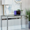 Youll be hard pressed to find a writing desk more chic or modern than this chrome writing desk constructed with steel with a clear temperedglass top Enjoy this desks clean lines and framed legs in highpolished chrome This table can also be used for displaying art and collectibles as well