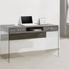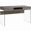 This uniquelystyled writing desk is finished in weathered grey with thick clear tempered glass side panels This desk features an open center compartment and two drawers with full extension Constructed with glass MDF particle board and engineered veneer quality is never compromised with this stylish desk