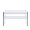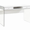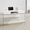 This writing desk appears to be floating in air as it features glass panels for its legs These panels support a large writing surface made of MDF and engineered veneers in a beautiful white finish With two drawers on either side of an open shelf there is plenty of space for your favorite pens and notebooks Enjoy working again with this contemporary masterpiece
