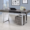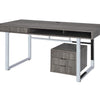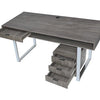 This modern desk will add a bold look to your office space Constructed with a chrome steel frame this desk is made from MDF particle board and engineered veneer with a weathered grey finish The desk features open storage compartments and four drawers to keep your extra pens close at hand This desk is also available in a glossy white finish