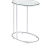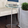 Never worry about drinks spilling on your sofa again with this convenient snack table Supported by a round base and frame with two legs this table is wellbalanced and pulls up to your sofa to sit snuggly beside it The round base slides just under the sofa allowing the table top to float over the seating area This keeps a small glass table within reach at all times Finished in chrome this table will work well with any decor